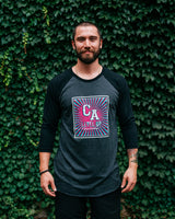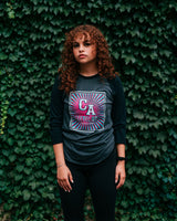 Ready to take your 'leap of faith'? Level up in our 5 color printed design. 3/4 fitted Unisex Raglan in heathered Dark Gray & Black.