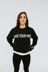 'SAVE YOU MIND' text box in black and white ink on a cropped sweatshirt.