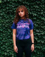 Our Orchid Purple custom Tie-dye Cropped Tee featuring our new 'Elevate' design with Periwinkle & Neon Magenta Ink.